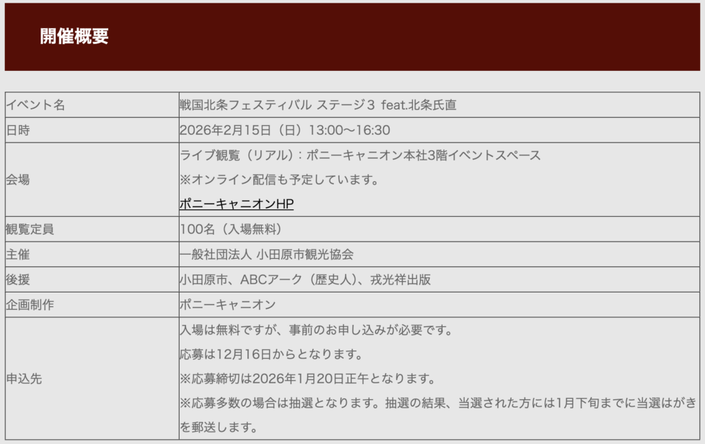 一般社団法人 小田原市観光協会主催、ポニーキャニオン企画制作の「戦国北条フェスティバル」が2026年も開催されます! 第3弾は北条氏直ですって。わ〜もう氏直きちゃったか〜と興奮しました(笑)